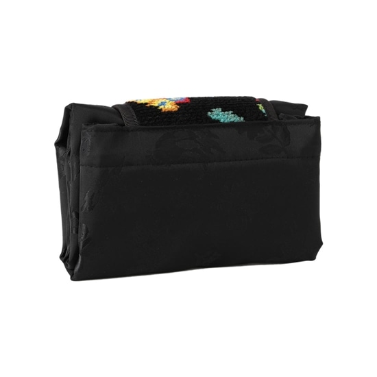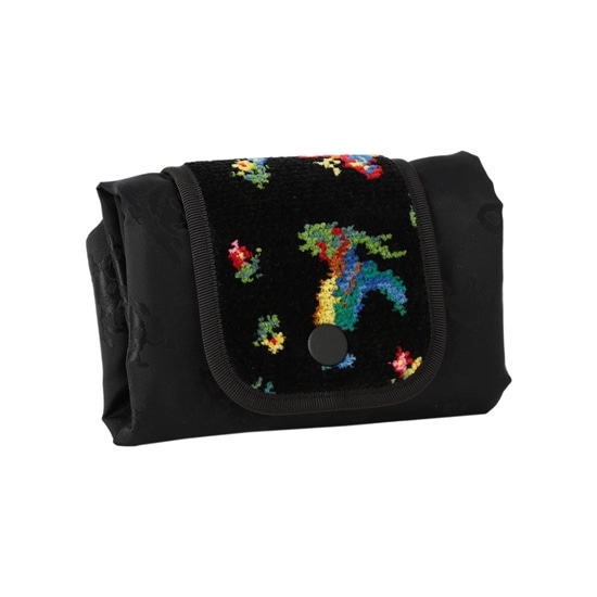 コンパクトに折りたためる、便利な携帯バッグです。フタにもなる留め具の部分には、デザインのアクセントとして『ハイジ』柄のシュニール織を使いました。本体には、同じく『ハイジ』のジャカードを使用しています。“可愛く小さくまとめられる”という点にこだわって作りました。
