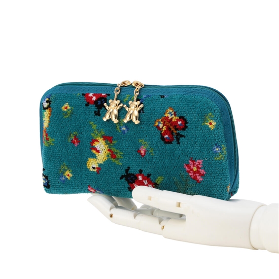 アヒルやちょうちょが踊る、賑やかな「ハイジ」シリーズの便利ポーチです。口が大きく開くラウンドファスナータイプで、中身の出し入れが簡単にできます。内側中央にはファスナーポケット、その両サイドにカードポケットを配しました。収納力に優れているので、長財布としてもご使用いただけます。