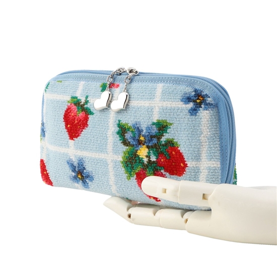 チェックやイチゴ、フラワーをあしらった「ストロベリーフィールドプティ」柄の便利ポーチです。開口部が大きく開くラウンドファスナーを採用して、中身が一目でわかるよう仕上げました。背面には便利なオープンポケットを配置。内側にはカードポケット、オープンポケット、ファスナーポケットとたくさんの収納スペースを備えています。