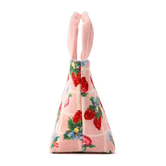 「ストロベリーフィールドプティ」のバッグです。甘い雰囲気が漂う、華やかな色彩と真っ赤ないちごがアクセント。幅広のマチをあしらい、荷物をしっかりと収納できる仕上がりに。内側にはオープンポケットも配して、使いやすくデイリーに活躍します。