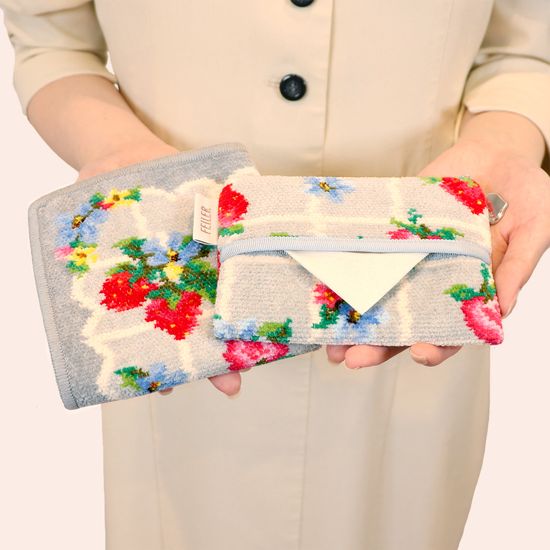 『ストロベリーフィールドプティ』のティッシュポーチです。ベースカラーをやわらかな雰囲気が漂うグレーにすることで、愛らしくて人気な柄に上品さをプラスしました。ポーチ機能付きなので、除菌グッズや目薬、常備薬などを持ち運ぶのにも重宝します。オンオフ問わず、デイリーユースにおすすめのアイテムです。