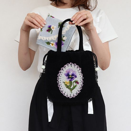 一夜の夢のような恋物語『真夏の夜の夢』。物語のかぎを握る花として登場するサンシキスミレを描いた「ナイツドリーム」のハンカチです。円形劇場で舞い踊る演者たちを、華やかなレースと可憐な小花で表現しました。ご自身用はもちろん、贈り物にもぴったりな1枚です。