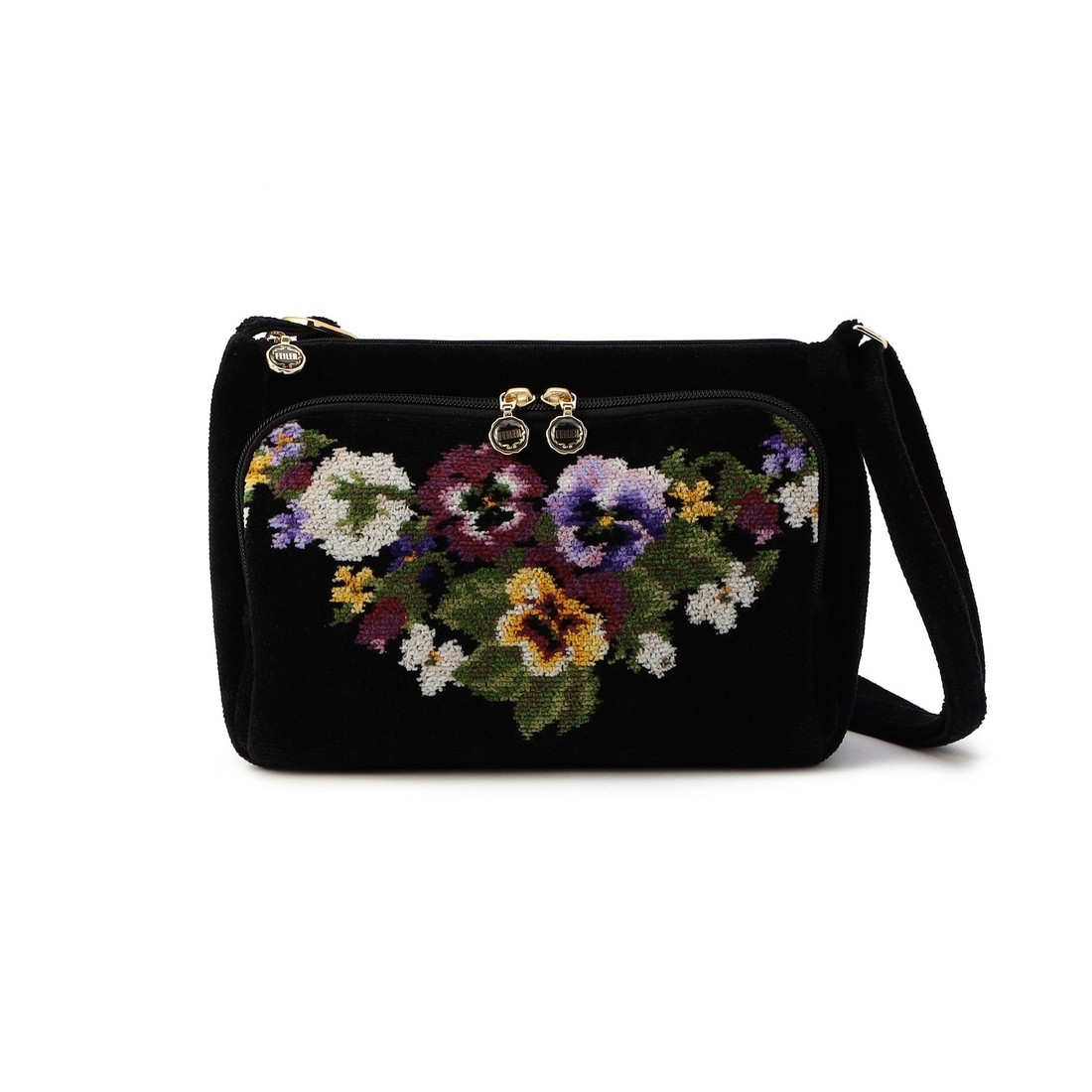 フロントのサンシキスミレが目を引く「ナイツドリーム」のショルダーバッグです。内外に複数の収納スペースを備えて、使いやすさにもこだわりました。背面は無地なので、シンプルなショルダーバッグとしてもお使いいただけます。両手があいて身軽に動けるので、ショッピングや旅先の街歩きでも活躍する一品です。
