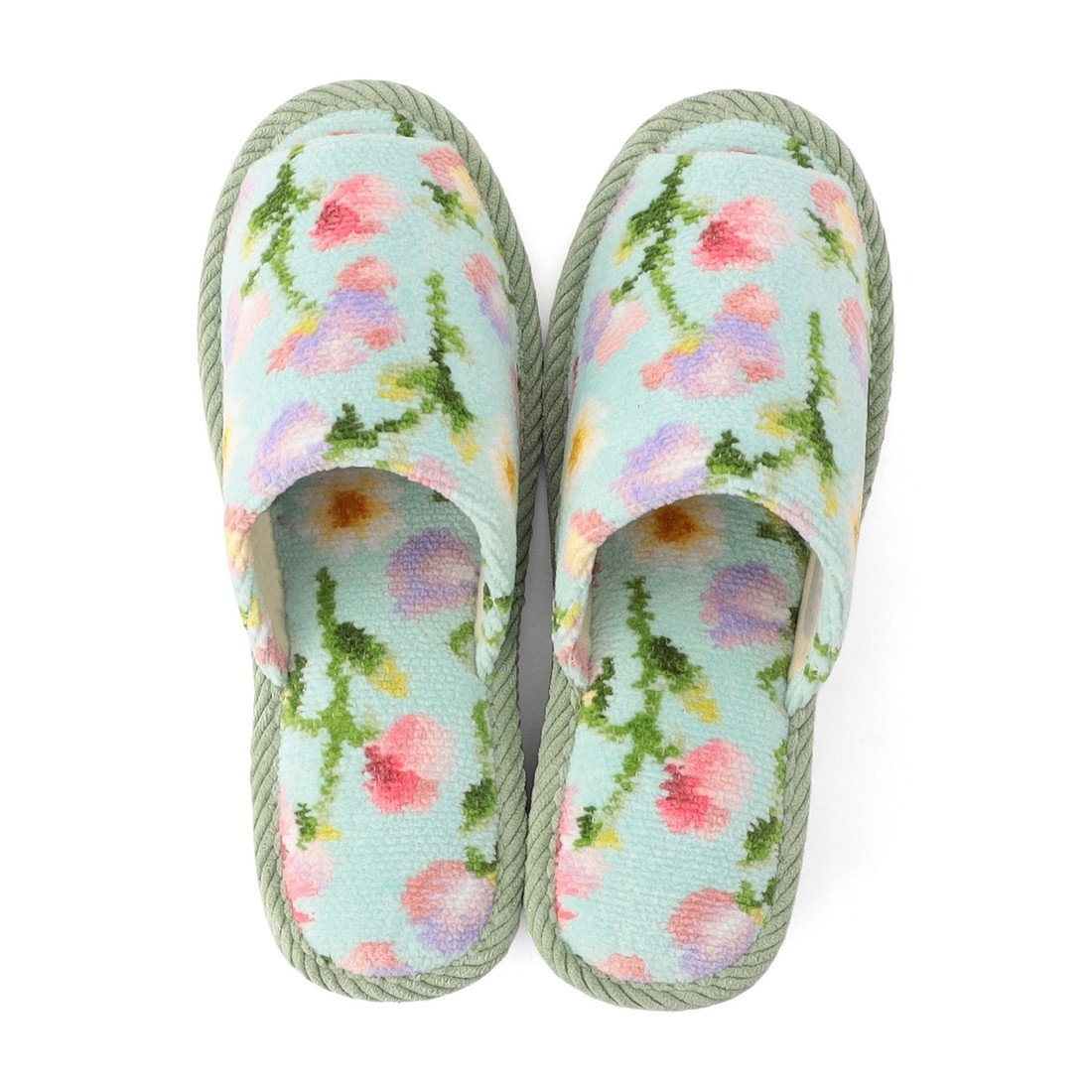 多彩な彩りに心がはずむ「スウィートスイートピー」のヒールスリッパです。透明感のある柔らかなペールグリーンをベースにした、華やかな柄が魅力的。程よい高さのヒールが歩きやすさをサポート。さりげなくスタイルアップできるのもうれしくて気分が上がります。ご自宅用にはもちろん、引っ越しなどで新生活を迎える方へのギフトにもおすすめです。