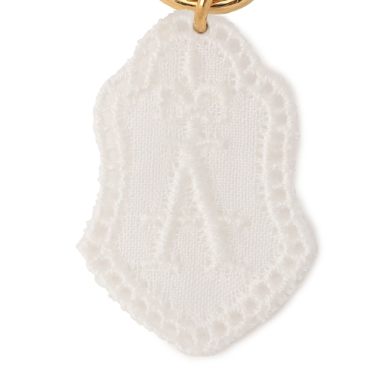 「モンノン」のハンカチチャームAです。可憐なレースにイニシャルをあしらい、特別感をプラスしました。ピアス状のリングを挿して留めるだけで、簡単に付けることができます。ご自身用はもちろん、ハンカチと一緒にギフトにするのもおすすめです。