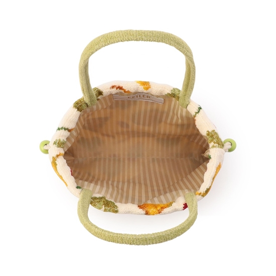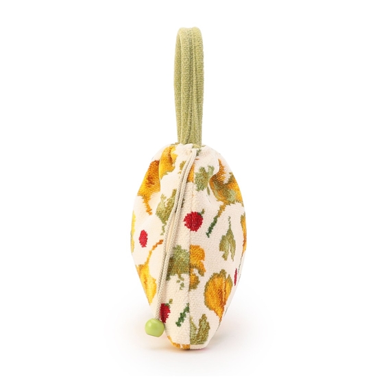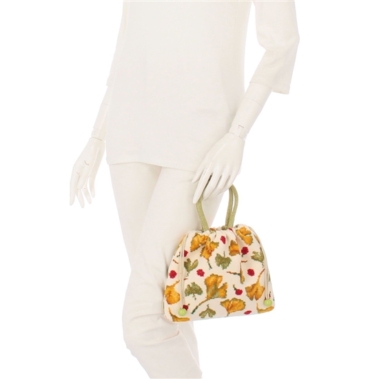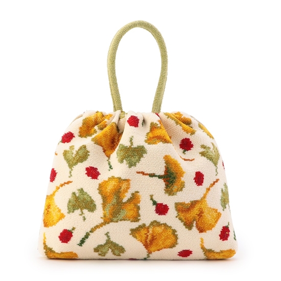 移りゆく季節を彩る黄金色の落葉。真っ赤な実が映える『ギンコウツリー』の手付き巾着です。表地のベースカラーと色味を合わせた、ストライプ柄の裏地にも注目。ハンドルが付いているので、そのまま持ち運ぶことも。バッグに入れて中身を整理したり、幅広い用途で役立つアイテムです。