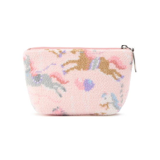 カラーの異なる木馬が愛らしい「ラブラリーモクバ」の舟型ポーチです。ぷかぷか浮かぶ風船や雲などもちりばめて、動きのある柄が印象的。淡いカラーで優しい表情に。ファスナーには、開閉しやすいバータイプの引き手を配しました。小物類をすっきりと収納できる一品です。