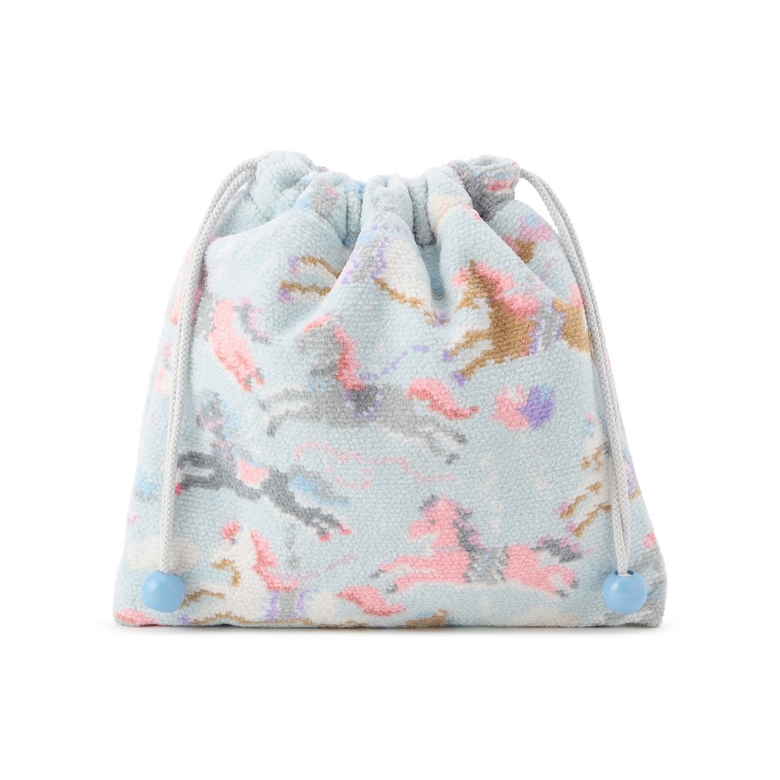夢の中にいるかのような、幻想的な世界を表現した「ラブラリーモクバ」の巾着です。明るいカラーで描かれた、たくさんの木馬が目を引きます。内側にはメッシュ素材を使い軽やかに仕上げました。コスメやお菓子、モバイルグッズなど、用途を選ばずに活躍する一品です。