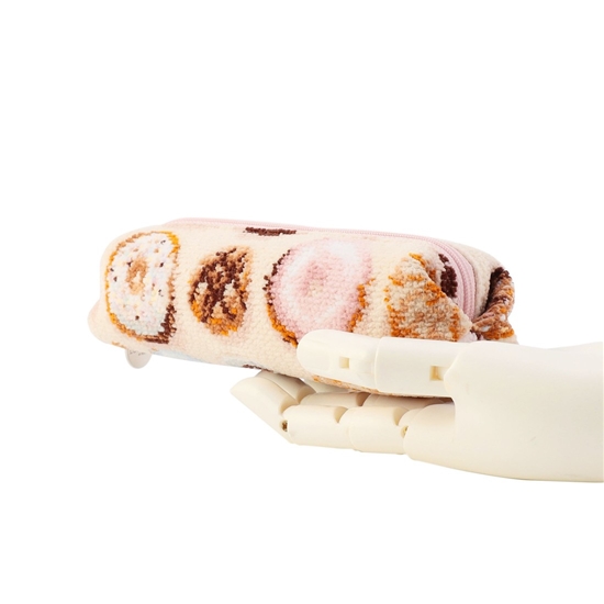 カラフルなドーナツが並んだ「モグモグドーナツ」のペンケースです。ファスナー部分にはロゴ入りのチャームをあしらいました。立体感のあるフォルムで、見た目以上の収納力も叶えます。文房具の収納や、メイク道具などを入れるのにも重宝する一品です。プレゼントにもおすすめ。