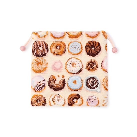 「モグモグドーナツ」の巾着です。ホームパーティを彩るドーナツBOXを彷彿とさせる柄は、眺めているだけでお腹が空いてきそう。手のひらに乗るほどの大きさで使いやすく、メイク道具などの細かなものを収納するのに便利です。内側にメッシュ素材を重ね、ハンドウォッシュ可能なのもうれしいポイント。