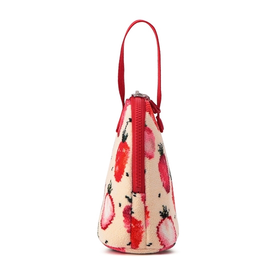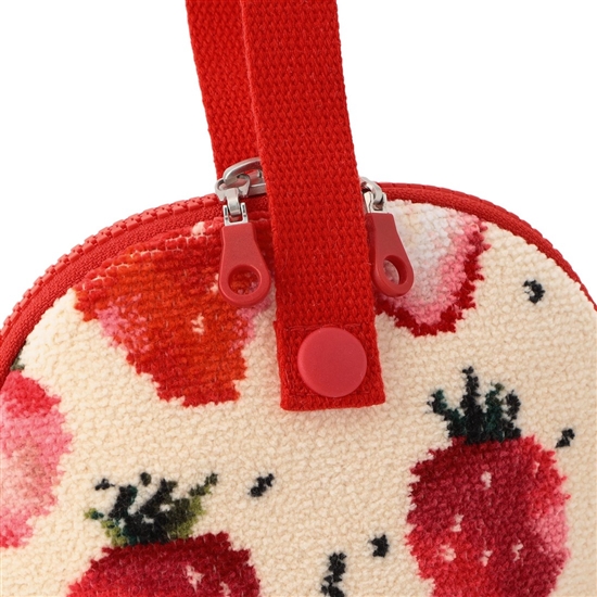 ベビーやキッズ用におすすめの「ストロベリードット」のマグポーチです。取っ手付きのマグカップをすっきり収納でき、バッグやベビーカーに提げて使える便利なベルト付き。ベルトはスナップボタンで簡単に装着でき、開口部はラウンドファスナーで口が大きく開くため、カップの出し入れがスムーズに行えます。同柄のアイテムとそろえてギフトにいかがでしょうか。