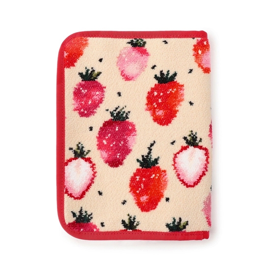 「ストロベリードット」のマルチケースです。食べごろの甘酸っぱいストロベリーに、チャーミングなドットを組み合わせた柄を表地に使い、内側は完熟したストロベリーを想わせる真っ赤な無地の裏地で切り替えました。カード収納箇所を充実させ、入れたものがひと目でわかる視認性の高いメッシュファスナーポケットや、ペン挿しも完備。お薬手帳や母子手帳、通帳など、さまざまなアイテムを入れて活用できます。