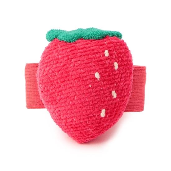 「ストロベリードット」のみずみずしいストロベリーをかたどったガラガラ。腕につけて振るたび音が鳴る、ベビーのおもちゃです。ストロベリーには優しい触り心地のシュニール織を、ベルト部分には着脱のしやすい面ファスナーを使用しました、ベビーの力では外れにくいところもポイント。同柄のアイテムと組み合わせて、出産祝いの贈り物におすすめです。