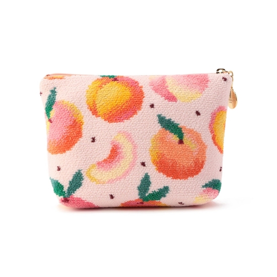 「ピーチドット」シリーズのポーチです。丸みを帯びた愛らしいフォルムのピーチをデザインしました。グラデーションカラーで立体感のある表情に。ピンと伸びたグリーンの葉も可愛らしいポイント。さりげないドット柄もアイキャッチ。内側に複数のオープンポケットを配して、小物も収納しやすく仕上げています。コスメやモバイルグッズ、イヤホン、カードなどさまざまな収納に活躍します。