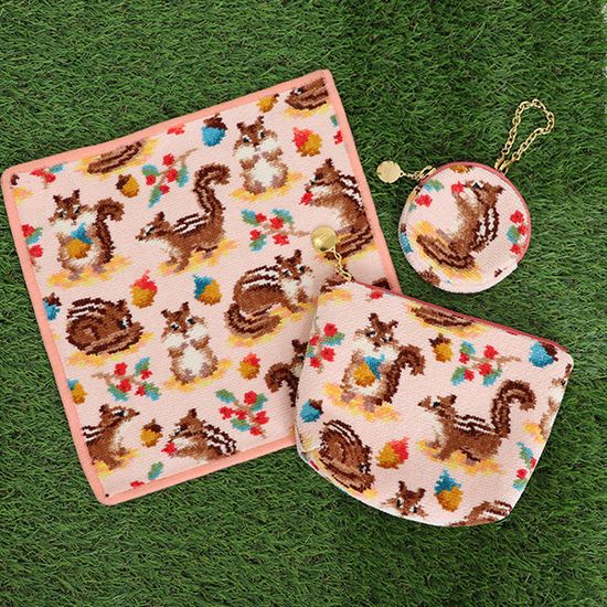 秋の森を思わせる「シマシマリス」のハンカチです。頬にたくさんの木の実を詰め込んだ、愛らしいシマリスたちが自由に過ごす姿を描いています。カラフルな木の実もデザインのポイント。シュニール織の優しい風合いと、かわいらしい柄は、使う人の心を和ませる魅力的な一品です。