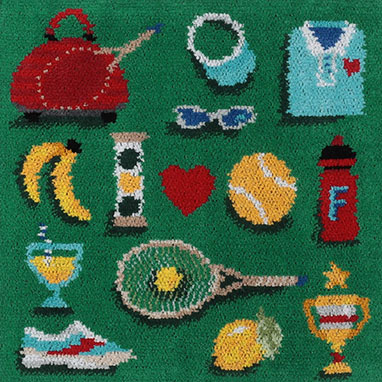 さわやかな朝の風を受けながら、解放感あふれるグリーンのテニスコートに、テニスファンの心をくすぐるおしゃれなアイテムが勢ぞろい。ボールセーバーと黄色いボールで、赤いハートマークをサンドして想いを綴るI LOVE TENNIS!
