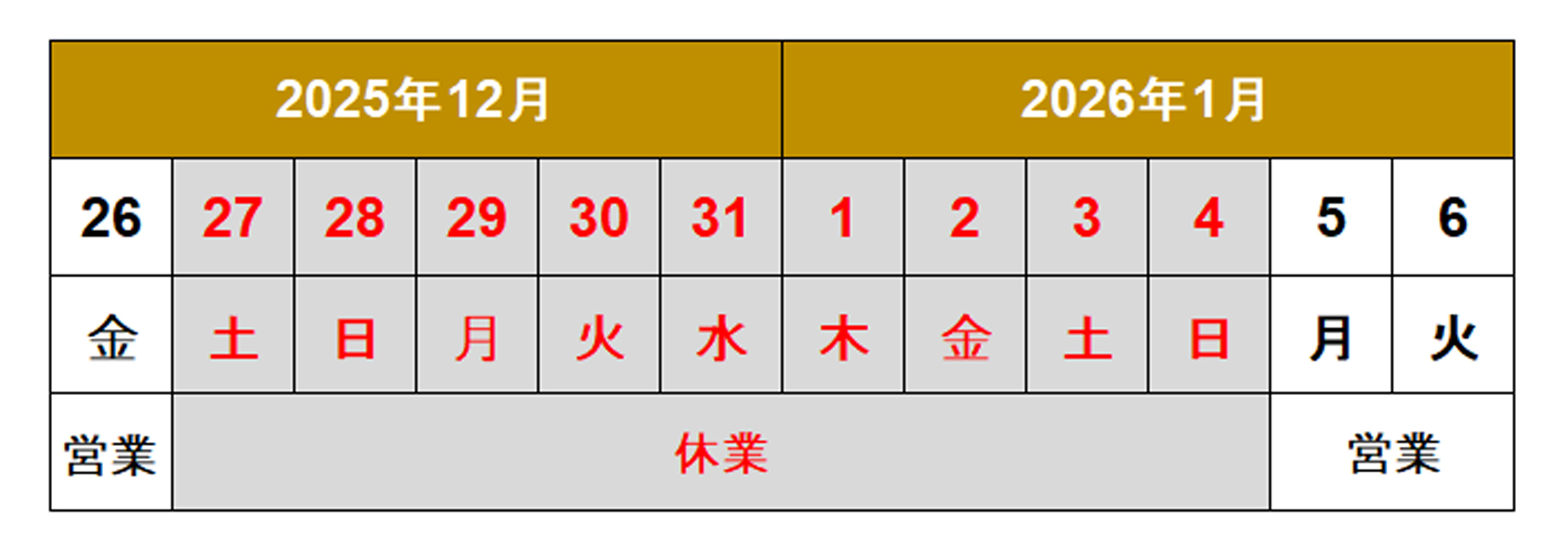 当ショップは2025年12月27日(土)〜2026年1月4日(日)の9日間、休業とさせていただきます。